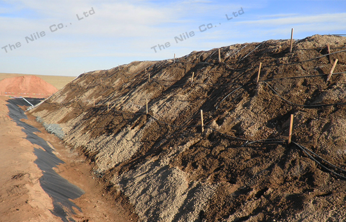 qíng化池铺好假底后,可将尾砂晒干并碾压成粉状,用人力、皮带运输机或装载机将尾砂装入池内,然后耙平。装料总原则为尽量保证均匀,料层疏松多孔。用石灰作保护碱时石灰随尾砂一块装入池中。