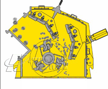 反击破的板锤和转子是刚性连接的,利用整个转子的惯性对物料进行冲击(撞击破碎、反击破碎、铣削破碎),使其不仅被破碎而且获得较大的速度和动能。板锤是自下向上迎接投入的物料进行冲击破碎,并把它们抛到上方反击板上。
