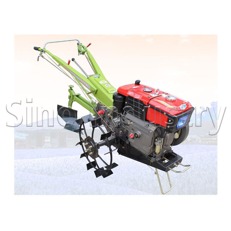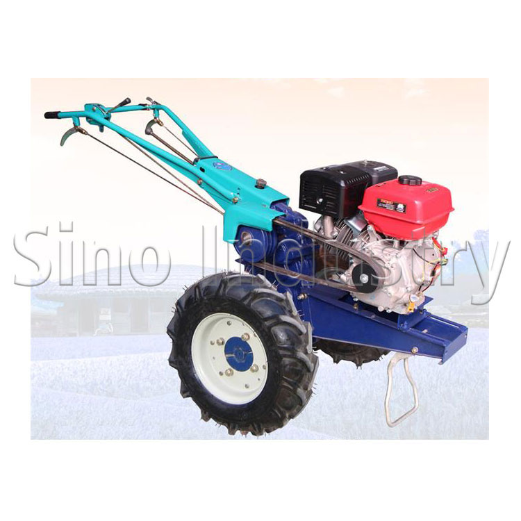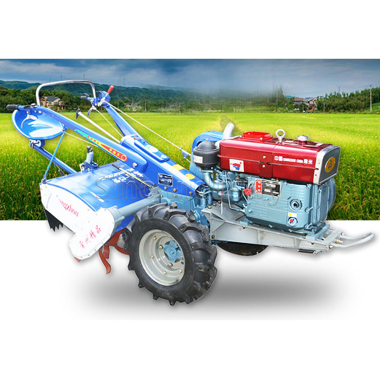 为改善驾驶员的工作条件,中国生产的手扶拖拉机增加1~2个支承轮并安装座位,成为乘坐型拖拉机;耕耘式手扶拖拉机又称无轮式手扶拖拉机,其特点是没有驱动轮,而是在驱动轴上装设旋转耕耘部件,既对土壤进行耕作,又能向前行走。机械结构手扶拖拉机一般由机架、动力装置、传动系、行走装置、转向系、制动器及操纵机构等组成。多采用卧式单缸柴油机,发动机的动力由三角皮带传给传动系,由离合器控制动力的转速。动力经链条传动箱传送到变速箱,中央传动、最终传动、转向机构和制动器都装在变速箱内。变速箱采用齿轮传动,变速档位随机型而异,一般为6+2档(即6个前进档,2个后退档),最少为3+1档,最多的可达12+6档。经变速后的动力,由中央传动及最终传动传给两侧驱动轮。转向机构采用牙嵌式离合器或铜球式离合器。操纵机构安装在手扶架上,用以控制油门、变速、转向、制动和动力输出。动力通过齿轮由动力输出轴或由发动机直接输出。行走装置为适应水田作业需要,除轮胎外还配有多种铁制叶轮,此外还装有尾轮。尾轮有运输轮和耕耘轮两种,前者用来支承重量,协助转向;后者用来调节耕深。水田作业时可换用滑橇。