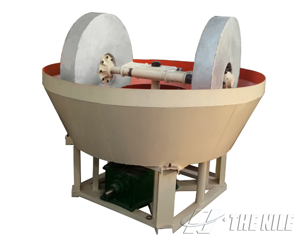 该设备主要有动力装置、机架、水盆、碾轮、碾盘等部件组成,采用轮动式磨矿工作方式:首先电动机将动力传动到减速机,在减速机带动下,通过大立轴将力矩传递给上方的横轴,然后经安装在横轴两端的拉杆传递到碾轮,使碾轮产生驱动力,沿横轴水平方向做逆 时针旋转运动;工作时的碾轮既能围绕湿碾机大立轴公转,又能围绕碾轮中轴进行自转,碾盘则固定不动。